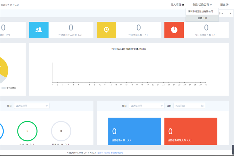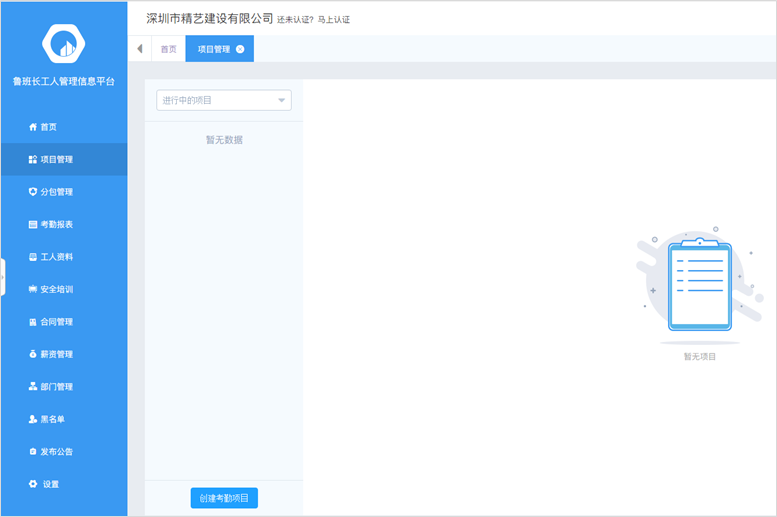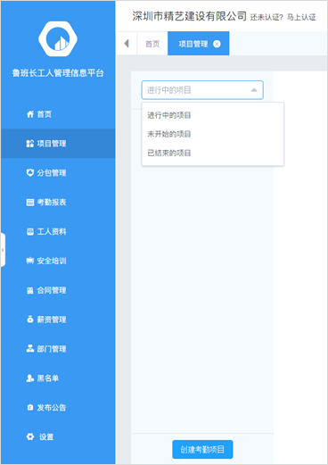 6、認證審核通過后,在【項目管理】頁面,點擊【創建考勤項目】進入創建考勤項目頁面