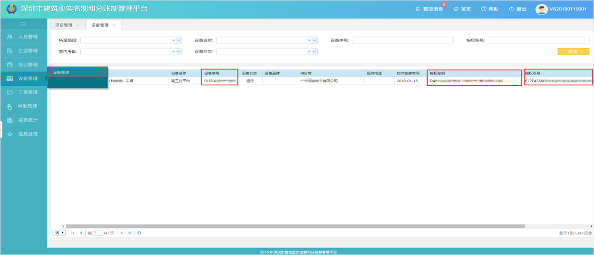 5、設備序號、授權賬號和授權秘鑰位于:兩制平臺>設備管理