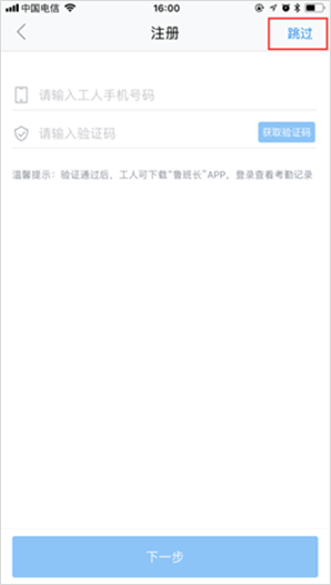 ①手機號碼(用魯班長APP管理端進行工人注冊時,按要求進行手機驗證即可,請勿選擇【跳過】。如右圖)