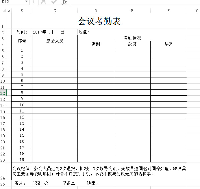 備注:會(huì)議紀(jì)律:參會(huì)人員遲到2次通報(bào),扣2分,3次領(lǐng)導(dǎo)約談,無(wú)故早退同遲到同等處理,缺席需向主要領(lǐng)導(dǎo)說(shuō)明原因;開(kāi)會(huì)不許接打手機(jī),不說(shuō)不做與會(huì)議無(wú)關(guān)的話和事。